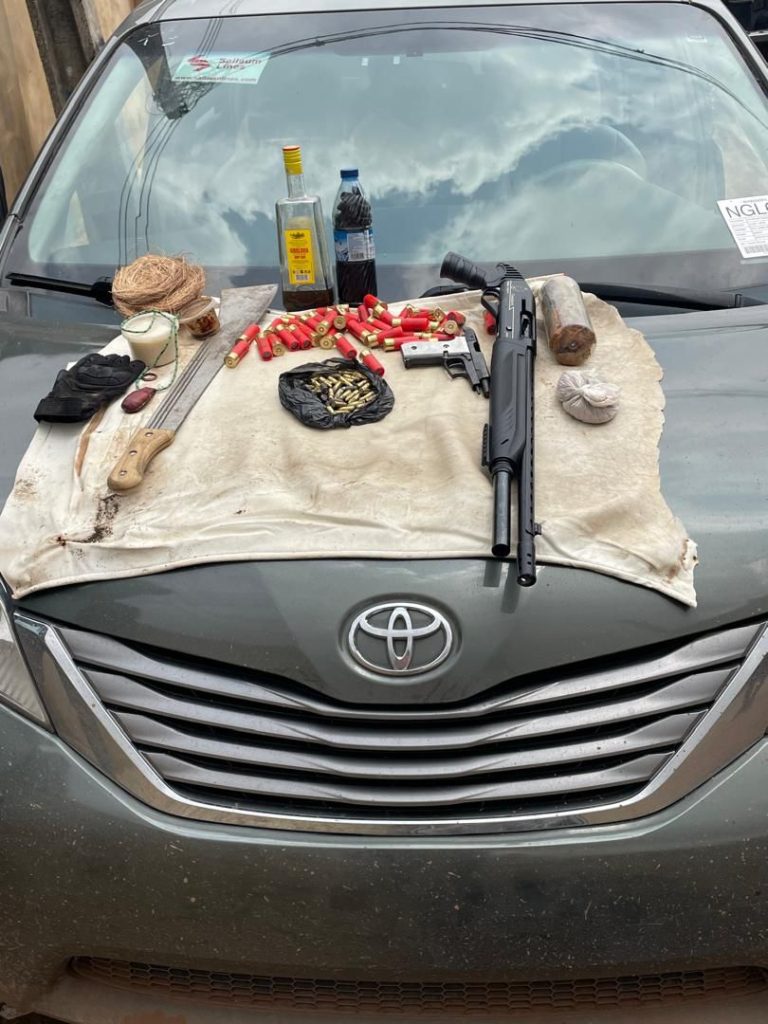Recovered exhibits from the suspects include one automatic pump-action shotgun, one Beretta pistol, 48 rounds of 9mm ammunition, 46 live cartridges, one cutlass, assorted charms, one Toyota Sienna, two Lexus ES350 cars, and one Toyota Corolla.