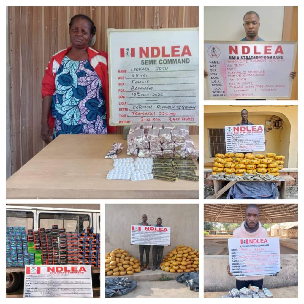 While commending the officers and men of the Special Operations Unit, MMIA, Seme, Kogi, Kaduna, Oyo and Osun Commands for the arrests, seizures and their dexterity, Chairman/Chief Executive Officer of NDLEA, Brig. Gen. Mohamed Buba Marwa (retd) enjoined them and their colleagues across the country to remain extra vigilant during the festive season and ensure that highest standard of professionalism is maintained in all their drug supply reduction and drug demand reduction activities all through the period and beyond.